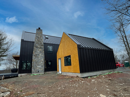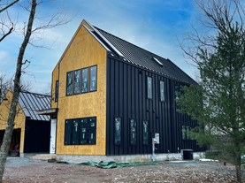 Our team installed 28 sq standing seam metal panel roofing and 29 sq siding on both the house and garage at this property in Hawley PA. Fabricating the 24 gauge 18" matte black panels and coping on-site, and also installing two deck-mounted skylights.